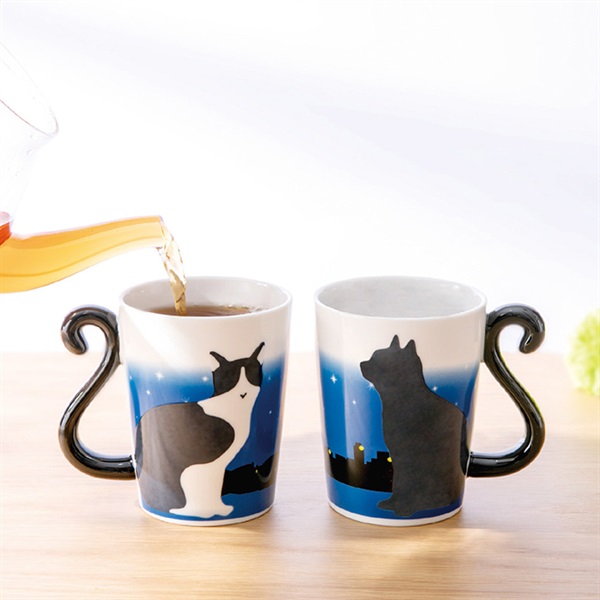 持ち手が可愛いTwinMug(ツインマグ)シリーズ。夜の街にたたずむネコのシルエットは、お湯を入れると白黒の柄が浮かび上がる不思議な仕様。ネコのしっぽを模した持ち手は二つ並べるとハートの形になります。